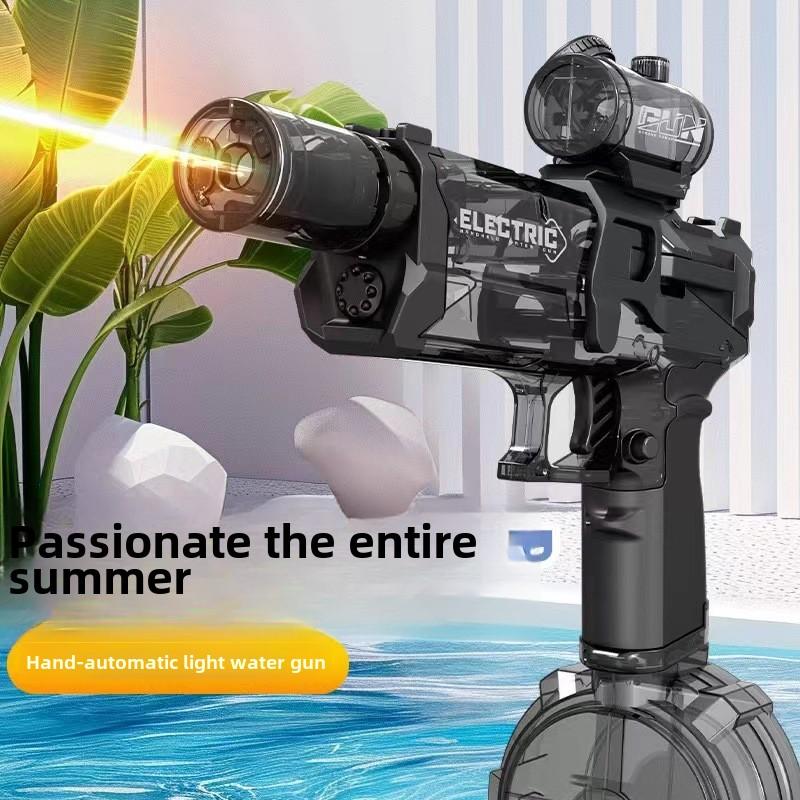 This high-capacity electric squirt water gun offers a luminous flame effect, perfect for summer outdoor activities. It's battery-powered, ensuring safe and fun play for boys and girls. An ideal birthday gift, it encourages imaginative play and keeps kids entertained. The durable plastic construction ensures longevity and reliability. Enjoy the excitement of water fights with friends and family, enhancing your summer experience.